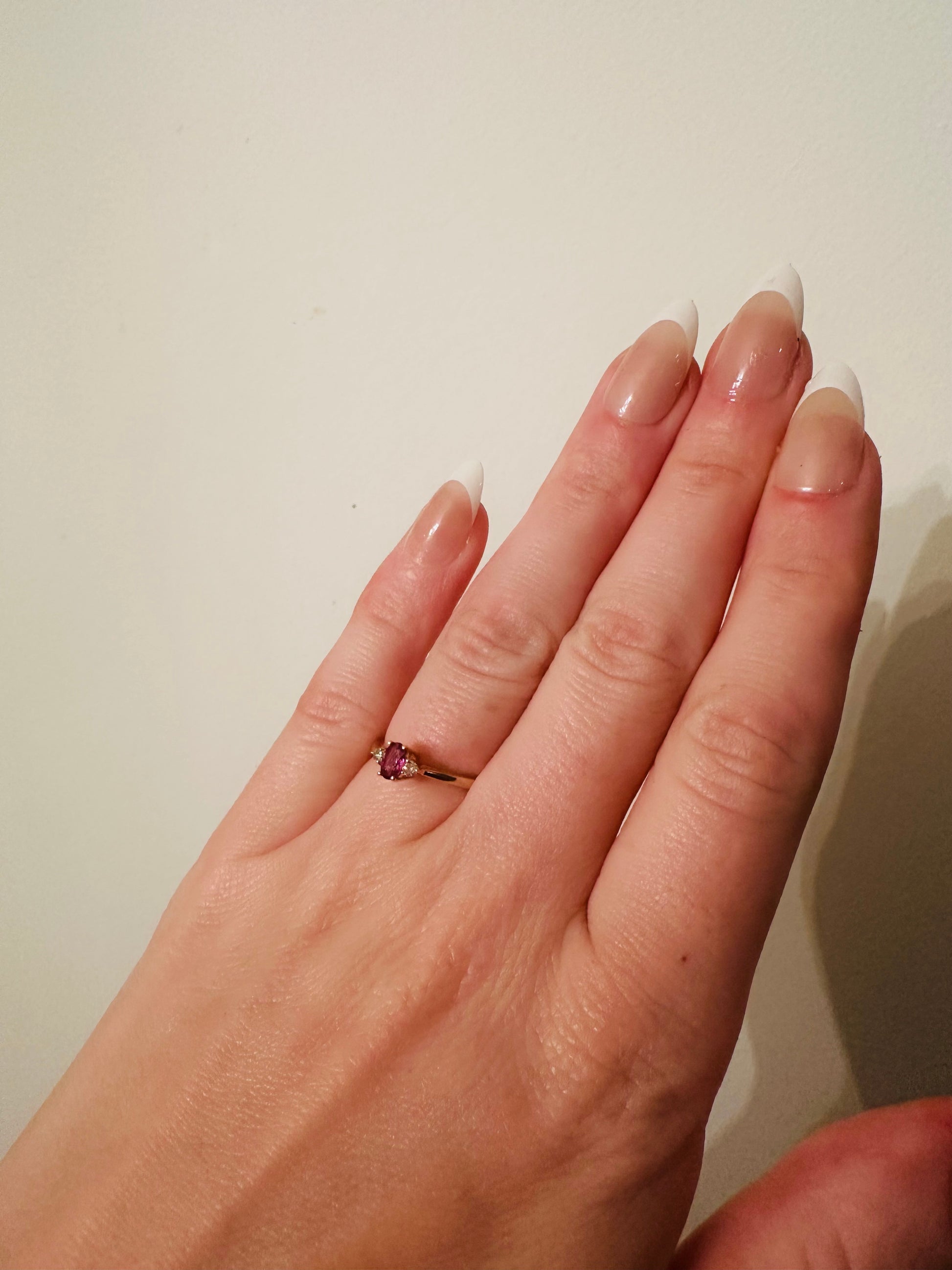 This elegant ring features a vibrant 5x3 mm oval-cut natural ruby at its center, securely set in four prongs. The ruby’s deep red hue is beautifully complemented by two sparkling round natural diamonds on either side, adding brilliance. The slim, gently tapered band enhances the gemstone’s presence. It is stamped 14k and "W" ( for Hallmark of the manufacture)